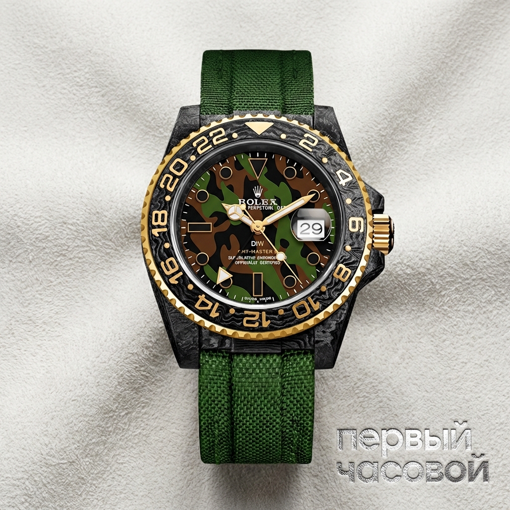 DiW Carbon GMT-Master II представляет собой радикальную деконструкцию классической архитектуры часов для путешествий, выполненную через призму современных композитных материалов. Корпус диаметром 40 мм изготовлен из цельного куска углеродного волокна, что обеспечивает уникальный визуальный паттерн для каждого экземпляра и снижает общий вес изделия до рекордных значений. Текстура материала, напоминающая дамасскую сталь, лишена глянцевого блеска, поглощая свет и подчеркивая инструментальный характер модели. Сапфировое стекло защищает циферблат, сохраняющий читаемость благодаря контрастным меткам и характерной GMT-стрелке.