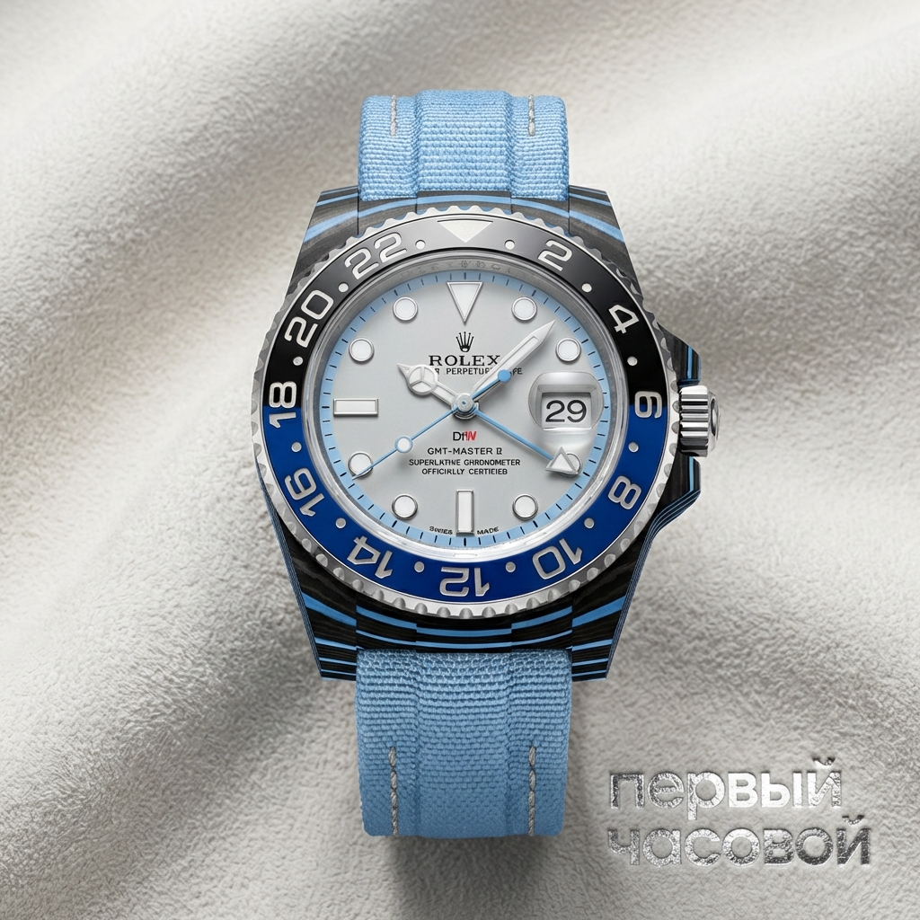 Сразу к делу: это часы для тех, кто устал от тяжести золота и стали. DiW делают грамотный тюнинг: берут за основу неубиваемый ролексовский механизм 3285 (лучший в классе GMT) и упаковывают его в карбон. На выходе мы получаем «трактор» с надежностью танка, но в кузове болида Формулы-1. Главная фишка здесь — вес. Часы настолько легкие, что про них забываешь через пять минут носки. Каучуковый ремень только усиливает комфорт, запястье под ним не потеет так, как под браслетом.
