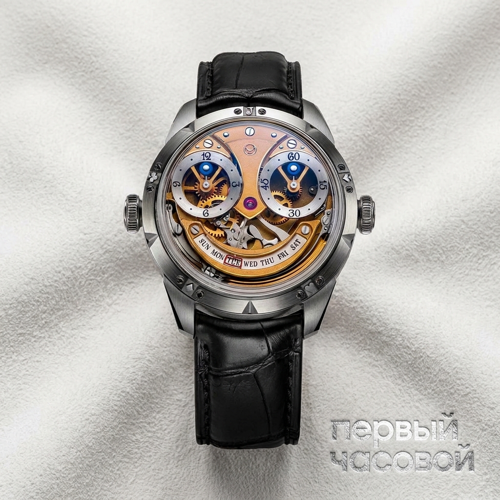 Часы Konstantin Chaykin иллюстрируют подход независимой мануфактуры к классическим принципам микромеханики и архитектурной выразительности. 40-миллиметровый корпус из нержавеющей стали демонстрирует точную геометрию ушек и комбинированную финишную обработку профиля, где полированные грани контрастируют с сатинированными поверхностями. Оптические свойства сапфирового стекла открывают доступ к многоуровневой структуре циферблата. Апертура дня недели интегрирована в композицию с математической точностью, сохраняя строгий визуальный баланс. Тактильные свойства кожаного ремешка дополняют физику холодного стального сплава.