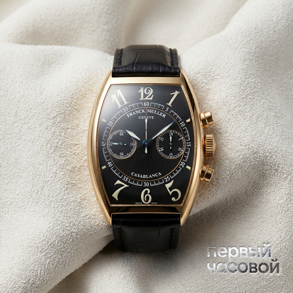 Сразу к делу: перед нами классическая «бочка» Cintrée Curvex, которая сделала Мюллера знаменитым в начале нулевых. Размер 32 на 45 мм на бумаге кажется скромным, но не дайте цифрам себя обмануть — за счет формы и длинных дужек часы ощущаются на руке как полноценные 39-40 мм круглого корпуса, при этом идеально огибают запястье. Техническая часть: внутри стоит механический хронограф, базирующийся, вероятнее всего, на доработанном ETA 2894 или Valjoux, что для будущего владельца отличная новость — механизм надежный, запчасти есть, обслуживание не требует отправки в Швейцарию.