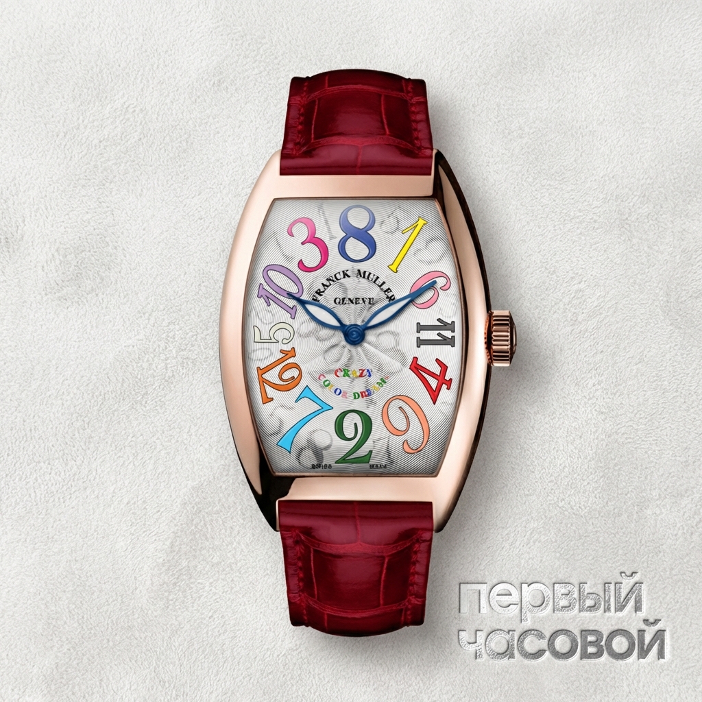 Franck Muller Cintree Curvex Color Dreams представляет собой квинтэссенцию авангардного подхода мануфактуры к архитектуре корпуса и дизайну циферблата. Корпус из 18-каратного розового золота размером 32,0 x 45,0 мм выполнен в культовом форм-факторе Cintree Curvex, отличающемся сложной трехосевой геометрией и изогнутым профилем, обеспечивающим идеальное прилегание к запястью. Доминантой экстерьера выступает гильошированный циферблат, украшенный крупными разноцветными арабскими цифрами — фирменным знаком коллекции Color Dreams, создающим эффект визуальной динамики.