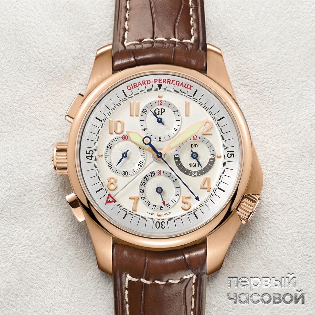 Girard-Perregaux R&D 01 Chronograph представляет собой квинтэссенцию спортивной архитектуры начала XXI века, воплощенную в корпусе из розового золота диаметром 43 мм. Данная модель (Ref. 49930) характеризуется уникальным инженерным решением: кнопки управления хронографом интегрированы непосредственно в ушки корпуса, создавая обтекаемый, но монументальный силуэт. Циферблат, защищенный сапфировым стеклом, демонстрирует сложную многоуровневую структуру с контрастными суб-накопителями и внутренней поворотной шкалой, управление которой осуществляется через дополнительную головку. Внутри установлен мануфактурный автоматический калибр GP033C0, отличающийся высокой точностью и запасом хода, достаточным для повседневной эксплуатации. Несмотря на массивную геометрию и спортивный профиль, водонепроницаемость ограничена 30 метрами, что определяет часы как предмет статусного гардероба, требующий бережного отношения к влаге. Отсутствие оригинальной упаковки и сертификатов в данном лоте смещает акцент исключительно на физическую сохранность корпуса и техническое состояние механизма.