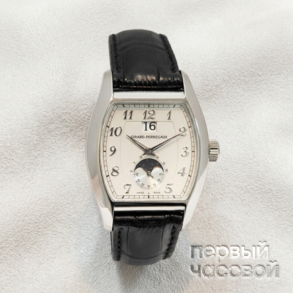 Girard-Perregaux Richeville Chronograph являет собой квинтэссенцию формы tonneau, вдохновленную эстетикой ар-деко и переосмысленную через призму современной часовой архитектуры. Геометрия корпуса с параметрами 36,0 на 49,0 мм отличается сложным профилем, где эргономичный изгиб массивных ушек обеспечивает плотную, анатомически выверенную посадку на запястье. Полированные грани корпуса взаимодействуют со светом, подчеркивая монументальность конструкции и визуально отделяя зону безеля от функциональных пушеров хронографа. Сапфировое стекло защищает циферблат с классической раскладкой, где счетчики интегрированы с математической точностью для сохранения симметрии. Механическое сердце модели — мануфактурный калибр с автоподзаводом — отвечает за функционал усложнения, сохраняя при этом баланс между надежностью и высотой механизма.
