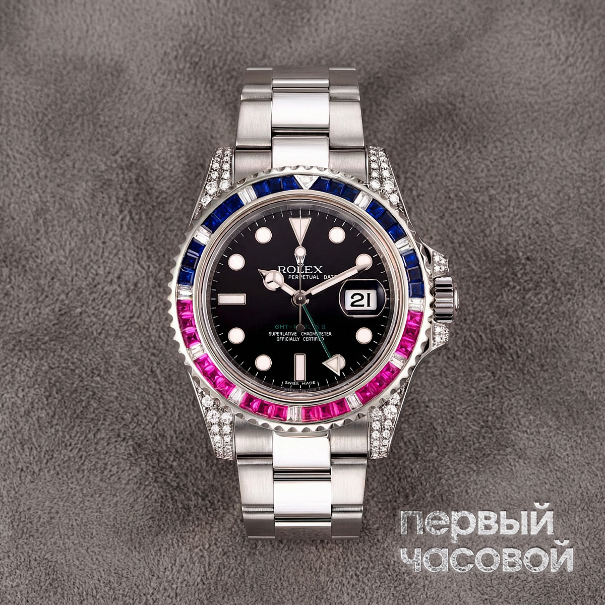 «Давайте начистоту: перед нами не просто заводской Rolex GMT-Master II, а смелый кастом на базе классического 116710LN. Здесь взяли «рабочую лошадку» на калибре 3186 и полностью переосмыслили её характер, добавив бриллиантовый сеттинг и безель в цветах Pepsi. Это уже давно не строгий инструмент для пилотов с функцией GMT, а чистое ювелирное украшение, которое громко заявляет о статусе владельца с первого взгляда.
