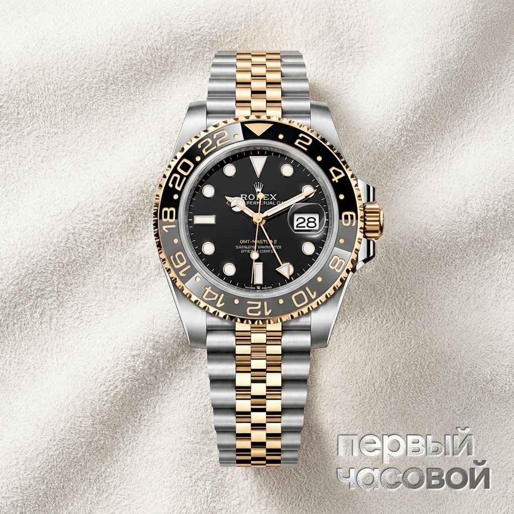 Технически внутри стоит калибр 3285. Это надежный «трактор» с 72-часовым запасом хода и функцией GMT, которая реально полезна, если вы часто летаете, а не просто сидите в офисе. Браслет — пятизвенный, и это спасение для биколора. Он гораздо комфортнее на запястье, чем Oyster, и лучше скрывает микроцарапины, которые неизбежно появятся на мягком золоте центральных звеньев в первую же неделю носки. Полированное золото собирает «паутинку» моментально, и с этим придется смириться.