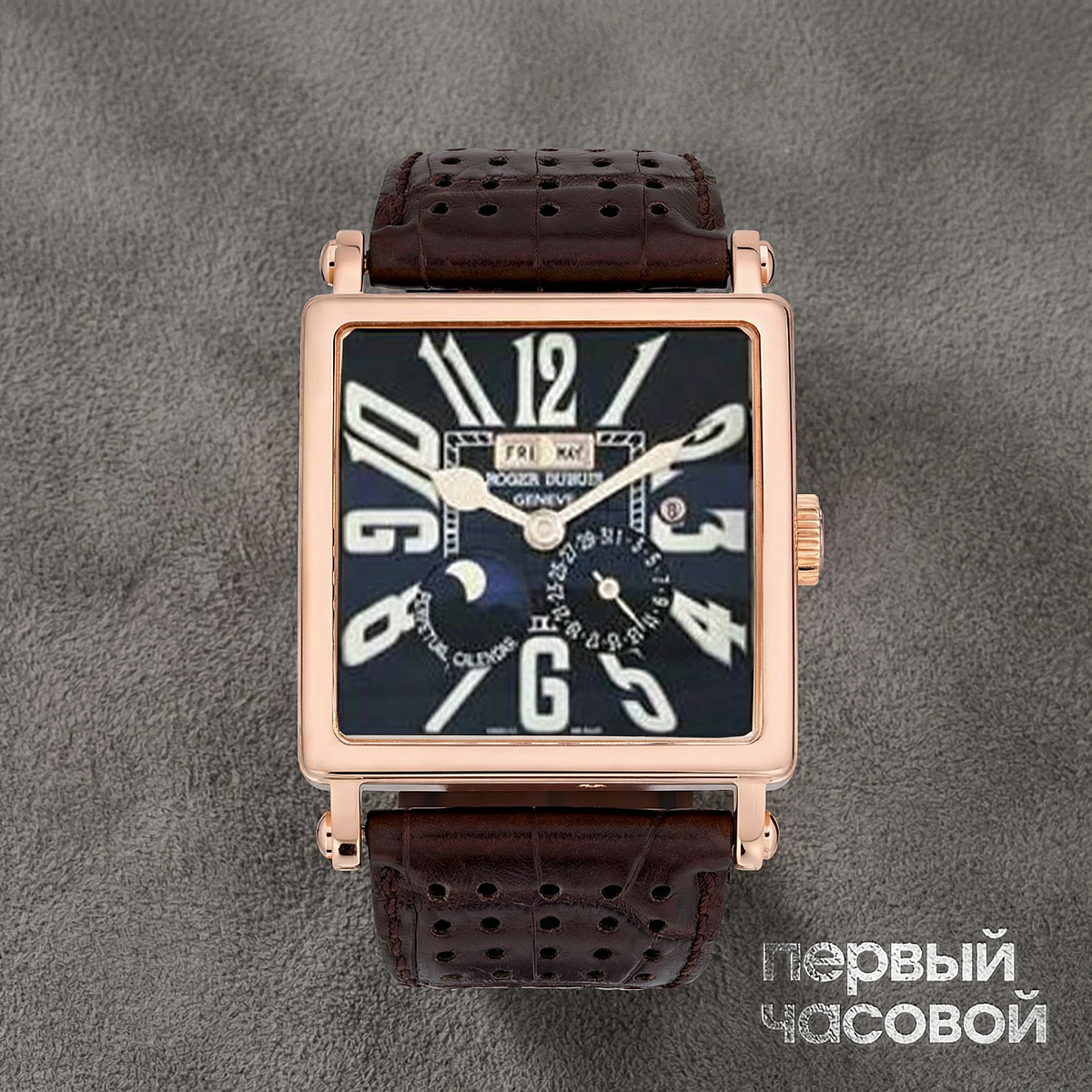 «Роже Дюбуа — бренд специфический, часто грешит излишним пафосом, но Golden Square — это другая лига. Это серьезная, тяжелая классика. Учтите сразу: квадрат 40х40 мм на руке ощущается гораздо крупнее круглых аналогов, это массивный кусок розового золота, который требует уверенного запястья.