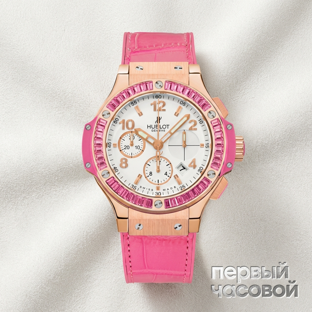 Сорок один миллиметр золота и розовых сапфиров — это не про скромность, это про громкое заявление на запястье. Размер пограничный: для большинства женских рук часы будут откровенно велики, создавая эффект оверсайз, за который, собственно, эту линейку Hublot и покупают.