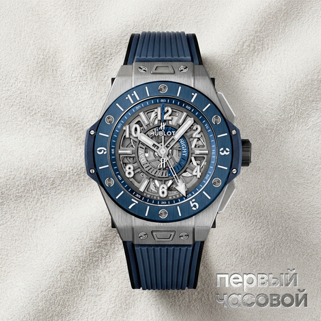 Центральным элементом визуальной композиции выступает скелетонизированный циферблат, открывающий вид на работу автоматического калибра HUB1251. Механизм с запасом хода 72 часа оснащен интегрированным модулем второго часового пояса, управление которым осуществляется посредством запатентованной системы кнопок, интегрированных в боковую грань корпуса, что исключает необходимость манипуляций с заводной головкой. Индикатор «день/ночь», расположенный в центре циферблата, обеспечивает интуитивное считывание домашнего времени, гармонируя с синими акцентами и люминесцентным покрытием индексов.