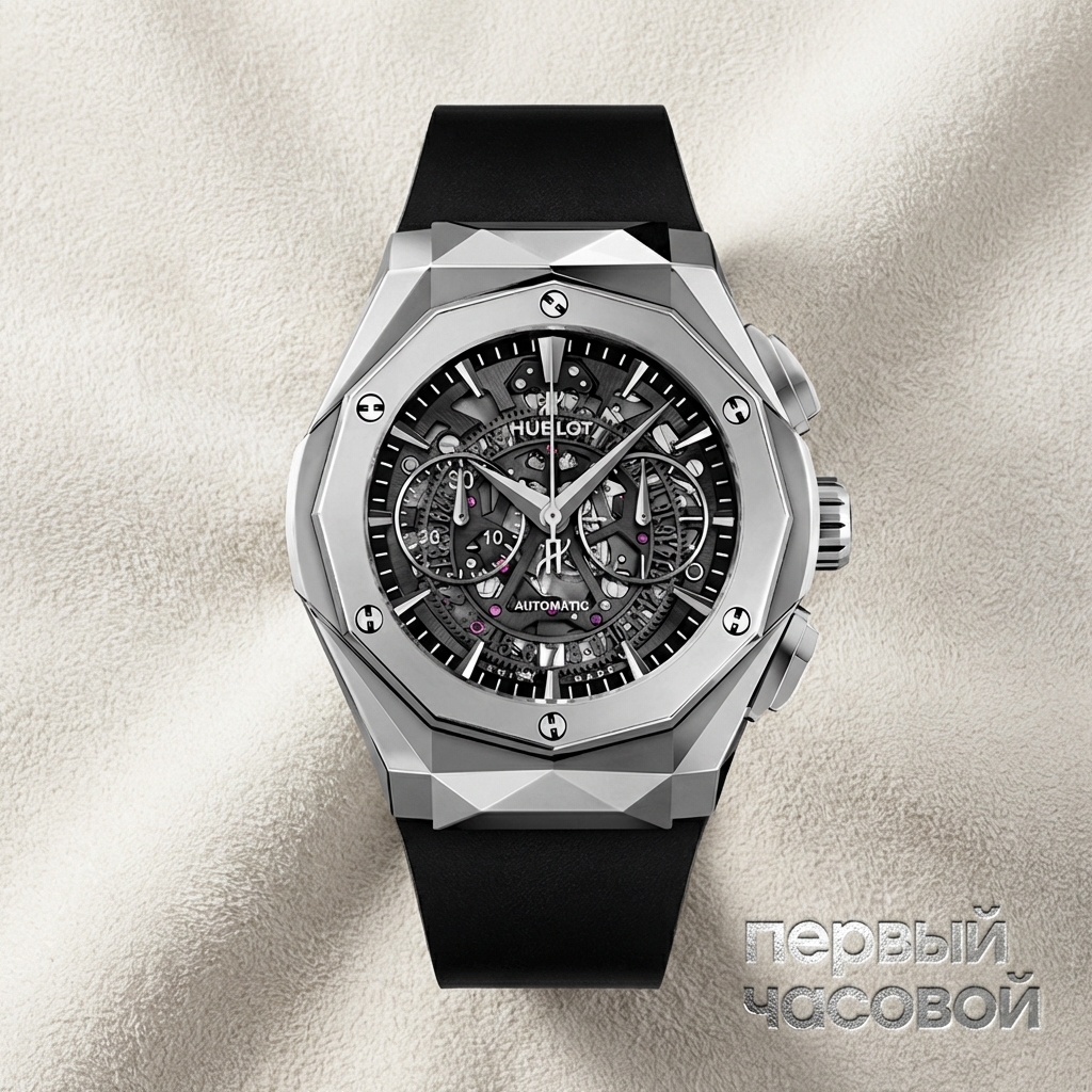 По технической части нужно понимать следующее. Внутри стоит калибр HUB1155. Это не мануфактурный Unico, а надежная «рабочая лошадка» на модульной базе. Для владельца это скорее плюс: механизм неприхотлив, проверен временем, и его обслуживание не будет стоить как крыло от самолета. Размер 45 мм пугать не должен — титан делает часы на удивление легкими, они не тянут запястье вниз, как стальные аналоги. Однако, зеркальная полировка граней — это магнит для царапин, поэтому об дверные косяки лучше не биться. Читаемость, как и у всех скелетонов, страдает, но здесь контрастные стрелки немного спасают ситуацию.