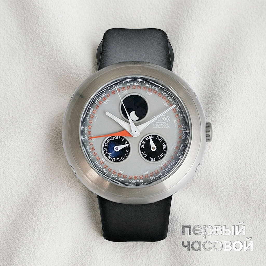 По механике здесь все серьезно: годовой календарь и фазы луны — это сложные усложнения, которые редко встретишь в дизайнерских часах, так что внутри не пустышка, а достойный калибр. Огромный плюс данного лота — наличие нового синего каучукового ремня, потому что поиск живой резины на старые Ikepod — это обычно дорогой и долгий квест. С точки зрения денег: модель нишевая, ликвидность не мгновенная, но свой круг ценителей у бренда есть, а полный комплект с документами страхует вложения. Отличный вариант, если нужна харизматичная вещь выходного дня, которая не выглядит как у всех.