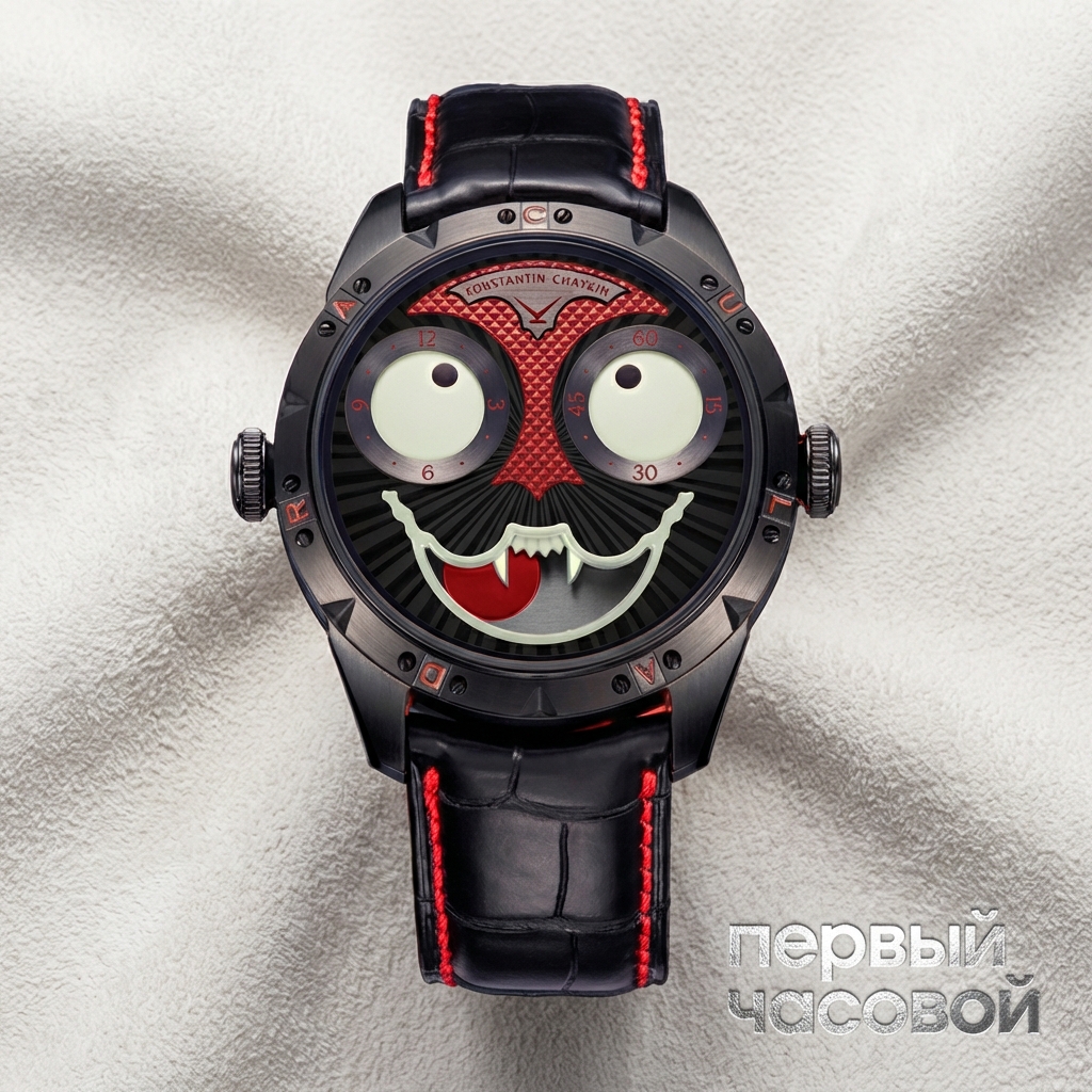 Konstantin Chaykin Joker Night Dracula представляет собой концептуальную эволюцию знаменитой коллекции «Ристмонов» (Wristmons), исполненную в подчеркнуто готической стилистике. Корпус диаметром 42 мм выполнен из стали с нанесением черного PVD-покрытия, что придает архитектуре часов монолитность и матовую текстуру, поглощающую свет. Антропоморфный циферблат технически реализован на базе мануфактурного модуля калибра K07-0, интегрированного с надежным базовым механизмом с автоподзаводом.