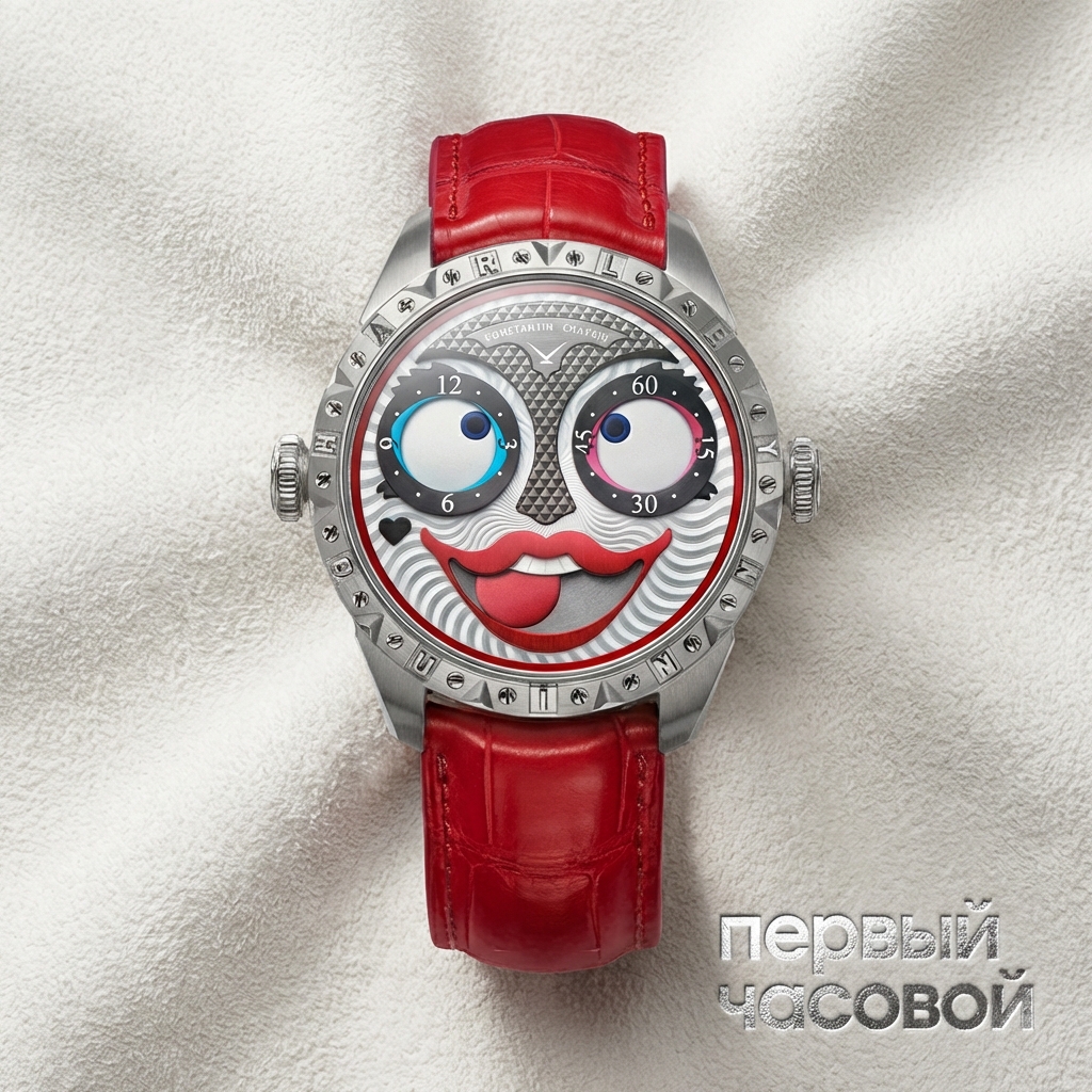 Konstantin Chaikin Harley Quinn K.07-4 представляет собой редкий пример интеграции высокого часового искусства и антропоморфного дизайна в рамках коллекции Wristmons. Стальной корпус диаметром 38 мм отличается сложной архитектурой: уменьшенные габариты сохраняют пропорциональный баланс, характерный для более крупных моделей серии, но адаптированы для женского запястья. Визуальная доминанта модели — циферблат с фирменным модулем джокер-индикации мануфактурного производства, который включает 69 компонентов и 8 камней. Дисковые регуляторы часов и минут функционируют как глаза персонажа, обеспечивая постоянную смену «выражения лица» часов, в то время как индикатор фаз Луны интегрирован в апертуру улыбки.