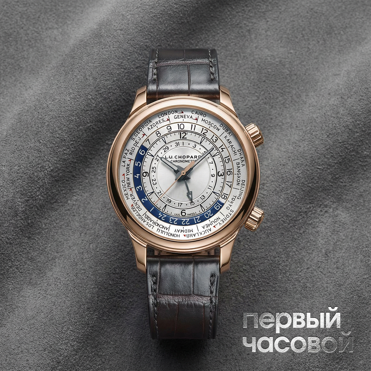 Корпус диаметром 42 мм выполнен из 18-каратного розового золота, что обеспечивает выразительную визуальную массу и долговечность. Архитектура корпуса с сапфировым стеклом ориентирована на оптимальную читаемость многоуровневого циферблата, где реализована функция мирового времени (World Time). Управление индикацией часовых поясов позволяет одновременно отслеживать время в 24 городах мира. Эргономика модели дополнена кожаным ремешком, подчеркивающим статус изделия как представителя коллекции L.U.C, ориентированной на коллекционеров и ценителей сложной механики.