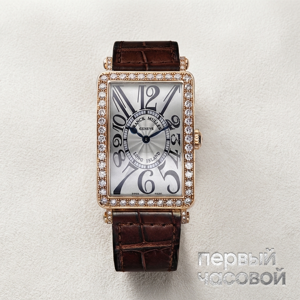 Женский Franck Muller в золоте с заводскими бриллиантами на кварце. Это базовый сценарий, когда часы берут ради узнаваемости корпуса, а не сложной механики. Кварц здесь — объективный плюс: настроил время и забыл, абсолютный трактор без лишней головной боли и дорогого репассажа.