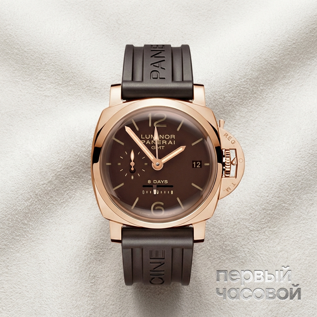 Золотой Panerai — это специфический жанр для тех, кто уже перерос базовые стальные модели, но не хочет уходить в классические костюмники. PAM00576 — это тяжелый, массивный золотой блок на запястье, который невозможно не заметить. Мануфактурный калибр P.2002 — это, пожалуй, лучший «ручник» у бренда: три барабана дают честные 8 дней, поэтому процесс завода превращается в еженедельный ритуал, а не ежедневную рутину. Линейный индикатор запаса хода здесь не для красоты, а реально рабочий инструмент, спасающий от внезапной остановки. Функция GMT и дата делают часы пригодными для частых перелетов, хотя таскать золото в путешествиях — риск собрать все царапины на полированный рант. Каучуковый ремень в комплекте — прагматичное решение, которое снижает градус пафоса и позволяет носить часы с джинсами, не выглядя при этом нелепо. Это нишевый продукт: ликвидность ниже стали, но техническая составляющая и вес золота полностью оправдывают ценник для фаната марки.