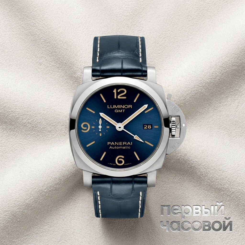Panerai Luminor GMT в корпусе диаметром 44 мм демонстрирует эталонный баланс между утилитарной эстетикой военных инструментов середины XX века и современной часовой архитектурой. Корпус из полированной стали AISI 316L выполнен в геометрии Luminor 1950, отличающейся характерной защитной скобой заводной головки с рычагом блокировки. Визуальной доминантой выступает циферблат глубокого синего цвета с финишной отделкой satiné soleil, реализованный по фирменной технологии «сэндвич»: люминесцентный состав бежевого оттенка Super-LumiNova нанесен на нижнюю пластину и виден через апертуры в верхнем диске, что обеспечивает высокую читаемость и архитектурную глубину.