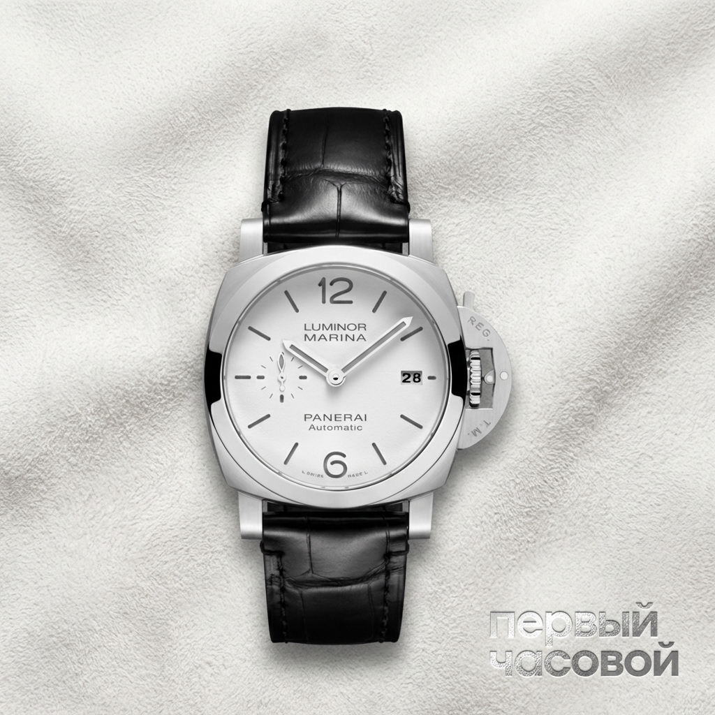 По механике здесь стоит калибр P.900. Это надежный «трактор» с запасом хода на 3 дня (72 часа). Для пользователя это означает, что часы можно снять в пятницу вечером и надеть в понедельник утром без подзавода. Механизм простой, ремонтопригодный и лишен детских болезней сложных мануфактурников. Белый циферблат — решение спорное для фанатов-панеристи, привыкших к черному «сэндвичу», но с точки зрения ликвидности он привлекает аудиторию, уставшую от милитари-мрачности.