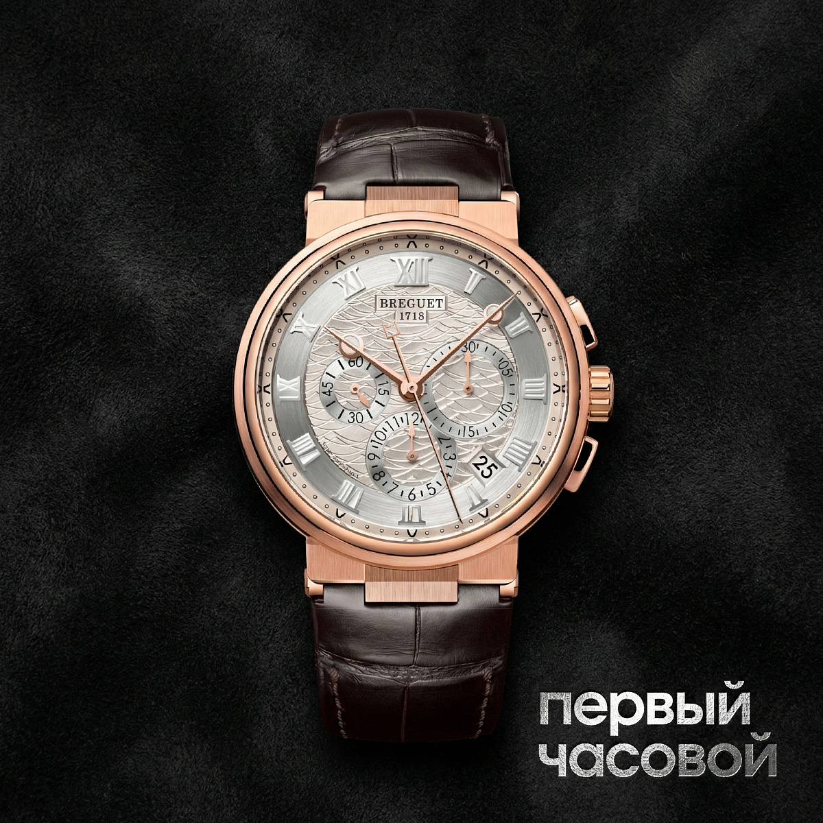 Циферблат, изготовленный из цельной золотой пластины с последующим серебрением, демонстрирует виртуозное владение техникой ручного гильоширования: центральный сектор декорирован уникальным волнообразным узором, создающим эффект динамической глубины и игры света. Накладные римские цифры из розового золота и граненые стрелки формы a pomme évidée («яблоко Бреге») заполнены люминесцентным составом, что обеспечивает безупречную считываемость показаний в условиях низкой освещенности. Архитектура хронографа реализована через три асимметричных субдиска (счетчики минут, часов и малая секунда), декорированных круговым гильоше, а трапециевидная апертура даты дискретно интегрирована между метками «4» и «5 часов».