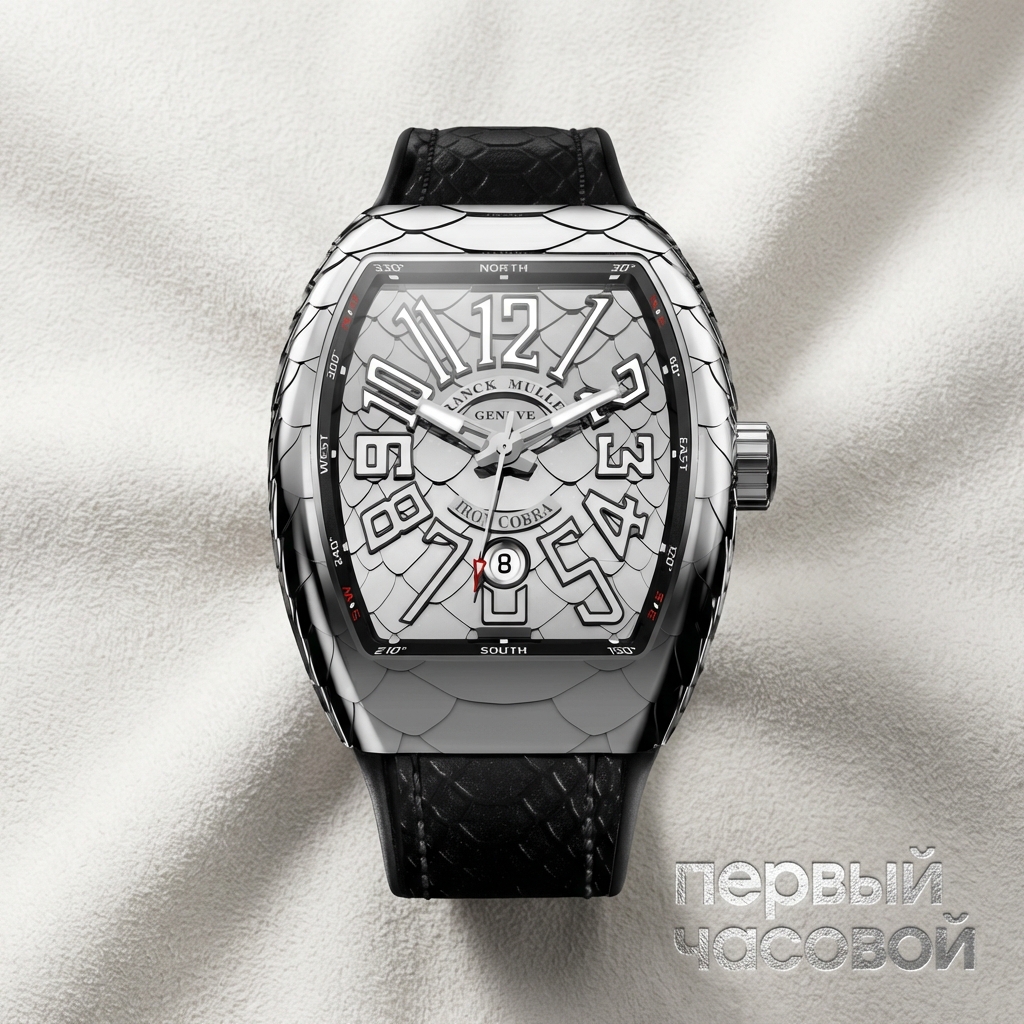 Franck Muller Vanguard Cobra представляет собой радикальную интерпретацию культового силуэта Cintrée Curvex, трансформированного в массивную архитектурную форму из белого золота. Корпус диаметром 44 мм лишен традиционных ушек крепления: каучуковый ремешок интегрирован непосредственно в структуру, создавая непрерывную эргономичную линию. Доминантой визуальной композиции выступает циферблат с трехмерным гильоше, имитирующим текстуру кожи кобры, где каждая «чешуйка» проработана для создания сложной игры света и тени. Накладные арабские цифры, характерные для мануфактуры, выполнены с тщательной полировкой граней и заполнены люминесцентным составом, обеспечивая контраст с рельефным фоном. Внутри установлен калибр с автоматическим подзаводом, отвечающий за индикацию времени и даты через апертуру в положении «6 часов». Экземпляр находится в заводском состоянии с сохранностью защитных пленок, что подчеркивает первозданный блеск драгоценного металла.