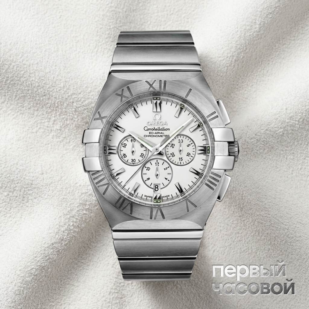 Omega Constellation Double Eagle Chronograph представляет собой архитектурную эволюцию знаковой линейки бренда, адаптированную к спортивной стилистике начала XXI века. Корпус диаметром 41 мм выполнен из нержавеющей стали и отличается характерной интегрированной геометрией, где браслет является визуальным продолжением ушек. Доминантой экстерьера выступают четыре полированные скобы «Griffes» в позициях «3» и «9 часов», которые функционально и визуально фиксируют сапфировое стекло, создавая контраст с сатинированными поверхностями.