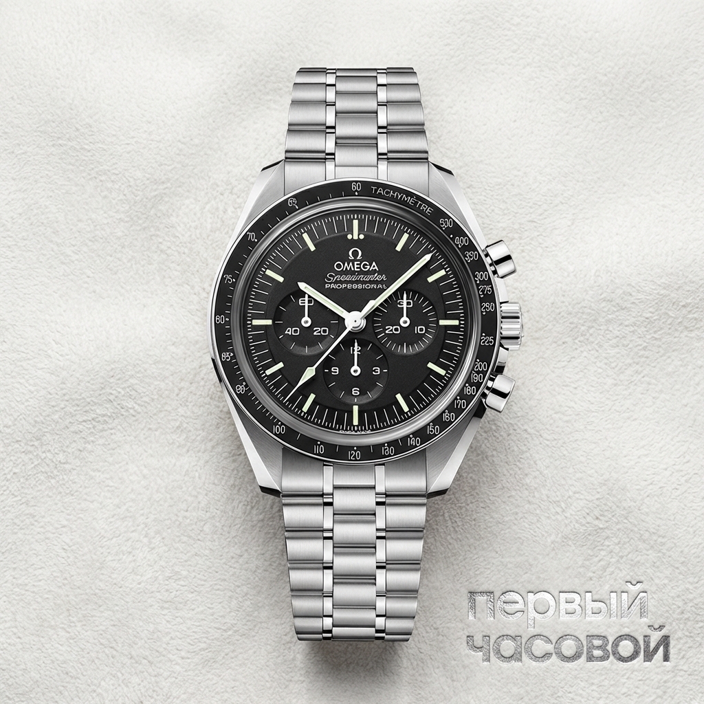 Omega Speedmaster Professional Moonwatch в данной референции представляет собой техническую эволюцию канонического хронографа, сохранившего узнаваемую архитектуру корпуса с лировидными дужками. Визуальная структура циферблата возвращается к историческому формату «step dial» с характерным перепадом высот, дополненным накладным логотипом, что является отличительной чертой версий с сапфировым стеклом.