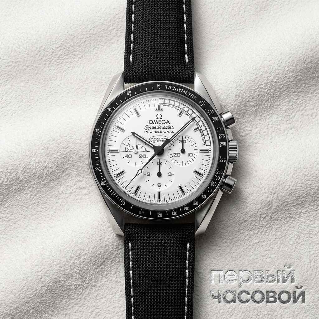 Давайте сразу к делу: перед нами «Святой Грааль» для фанатов Омеги и один из самых ликвидных активов часового рынка за последние годы. Это не просто очередной лимитированный Speedmaster, это тот самый «Белый Снупи», за которым гоняются коллекционеры. Белый циферблат полностью меняет восприятие модели, делая часы визуально легче и читаемее, чем классический черный Moonwatch. Керамический безель со светящейся шкалой — это то, чего не хватает базовым моделям для практичности в темноте.