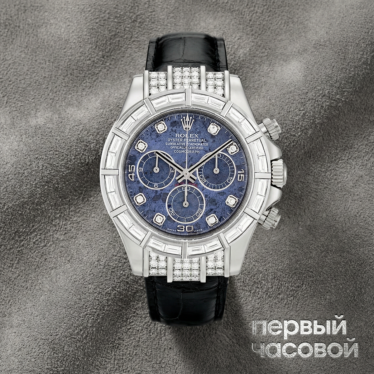«Давайте сразу по фактам, чтобы не тратить ваше время. Перед вами Rolex Daytona в белом золоте, но смотреть тут надо не на металл, а в центр. Циферблат из натурального содалита — это редкая история. Rolex мало делает таких "каменных" циферов, и каждый из них уникален: природный рисунок камня не повторить, поэтому двух одинаковых часов просто не существует. Это жирный плюс к коллекционной ценности.