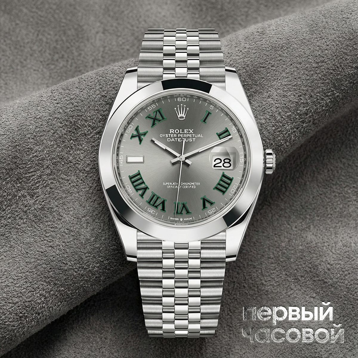 Многие боятся серых циферблатов, но здесь схема другая: темно-серый фон отлично гасит пафос, а зеленый контур римских цифр добавляет тот самый узнаваемый акцент, за который этот реф и любят коллекционеры. Ref 126300 — это гладкий стальной безель, и это плюс: часы выглядят спортивнее и не так сильно царапаются об манжеты, как золотые рифленые версии. Это идеальный daily beater — рабочая лошадка, которая и под пиджак, и под поло зайдет как родная.