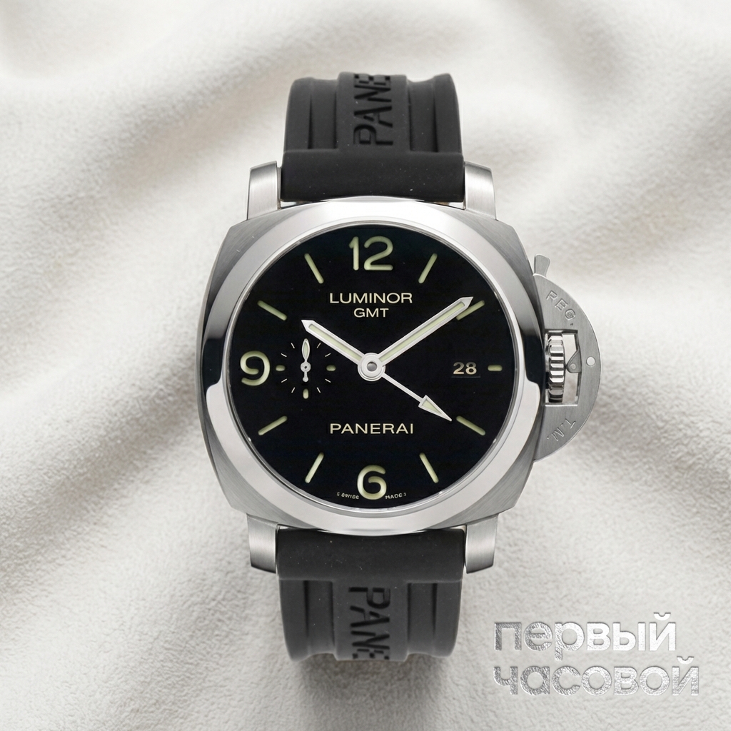 PAM00320 — это классика жанра для тех, кто понимает разницу между аксессуаром и инструментом. Сразу обозначу главный момент по данному лоту: отсутствие коробки и документов убивает коллекционную ценность, но делает этот экземпляр идеальным вариантом для покупки «на руку» по низу рынка. Корпус 1950 в размере 44 мм — это крупная, тяжелая артиллерия, которая на запястье меньше 17,5 см будет выглядеть как кандалы, поэтому примерка обязательна. Полированный безель будет собирать «паутинку» царапин, это неизбежность для Panerai, с которой нужно просто смириться. Технически здесь все честно: мануфактурный калибр P.9001 — надежный механизм, функция GMT реализована грамотно и не мозолит глаза, если не используется. Водозащита 300 метров позволяет не снимать их ни в душе, ни в океане. Это выбор для прагматика, которому нужны узнаваемые, неубиваемые часы на каждый день без переплаты за макулатуру.