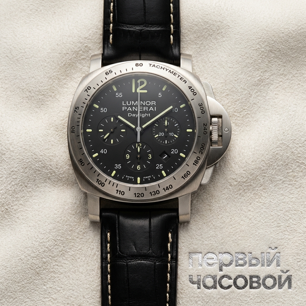 PAM 00250, более известный как Daylight — это часы из той эпохи, когда Panerai не пытались заигрывать с ультратонкими корпусами, а делали настоящие инструменты. Скажу прямо: это крупный, тяжелый кусок стали, который на запястье ощущается как серьезный актив, а не как бижутерия. Внутри стоит проверенный временем калибр на базе Valjoux 7753 — надежный «трактор», который любой вменяемый мастер обслужит за разумные деньги, запчасти на него есть везде, и это огромный плюс к ликвидности.