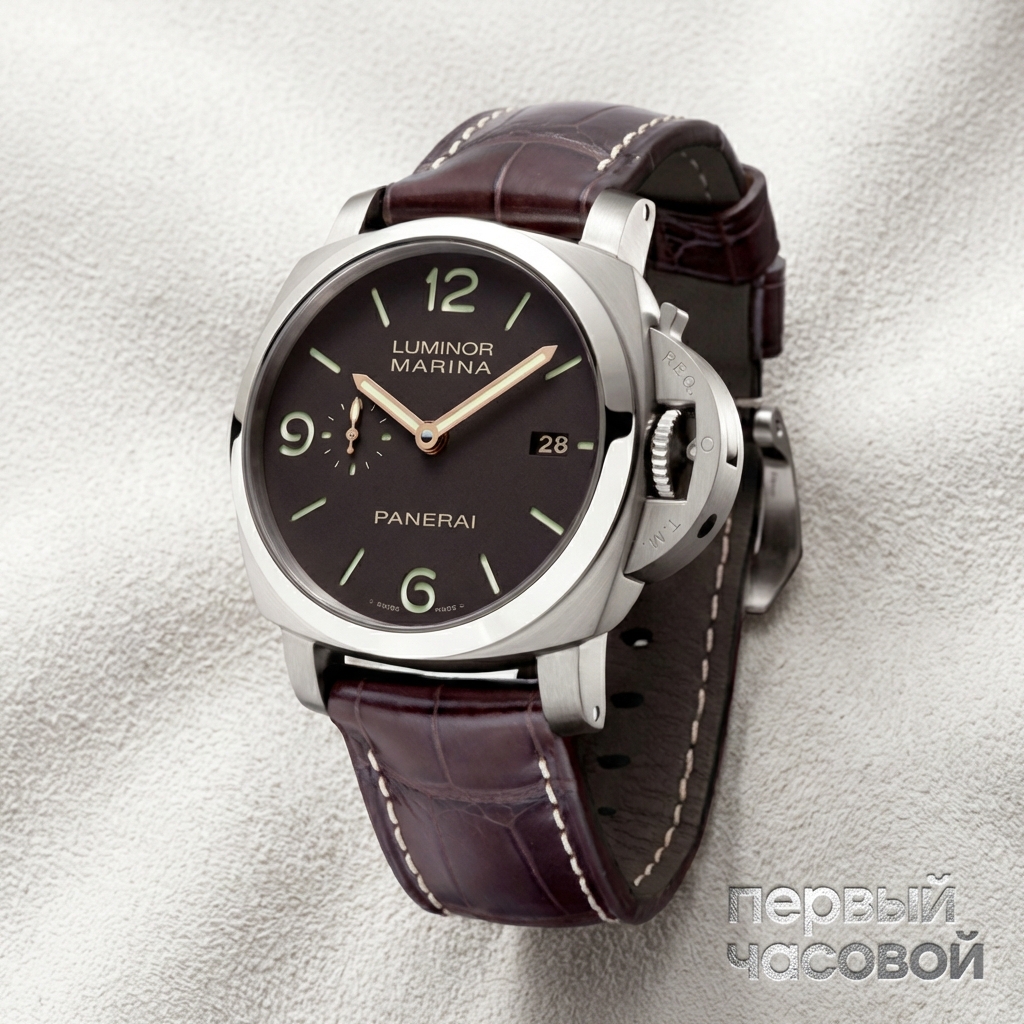 Визуально это одна из самых удачных комбинаций у Panerai: коричневый циферблат и золотые стрелки. Выглядит дороже и интереснее, чем базовый черный «сэндвич», но при этом не уходит в цыганщину. Внутри стоит P.9000 — надежный мануфактурный «трактор». Три дня запаса хода — это честный стандарт индустрии, позволяющий оставить часы на выходные. Также отмечу функцию независимого перевода часовой стрелки: для тех, кто часто летает, это намного удобнее стандартного перевода стрелок.