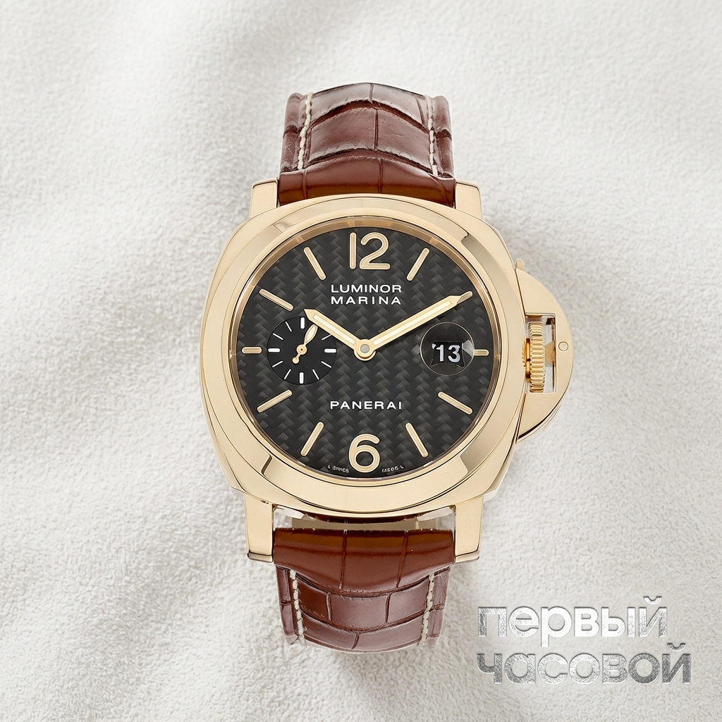 Panerai Luminor Marina в исполнении из желтого золота представляет собой монументальный образец часовой архитектуры, где утилитарный дизайн 1950-х годов переосмыслен через призму благородных материалов. Корпус диаметром 44 мм обладает характерной подушкообразной геометрией и оснащен запатентованным устройством защиты заводной головки, которое не только является исторической доминантой дизайна, но и обеспечивает герметичность конструкции до 300 метров. Полированные поверхности золотого корпуса создают значительный физический вес изделия, подчеркивая его статусность и тактильную массивность. Сапфировое стекло с антибликовым покрытием защищает циферблат с апертурой даты, сохраняя читаемость показателей в условиях низкой освещенности. Внутри установлен калибр с автоматическим подзаводом, отличающийся высокой надежностью и точностью хода. Наличие оригинальных документов подтверждает аутентичность данного экземпляра, что критически важно для моделей в драгоценном исполнении.