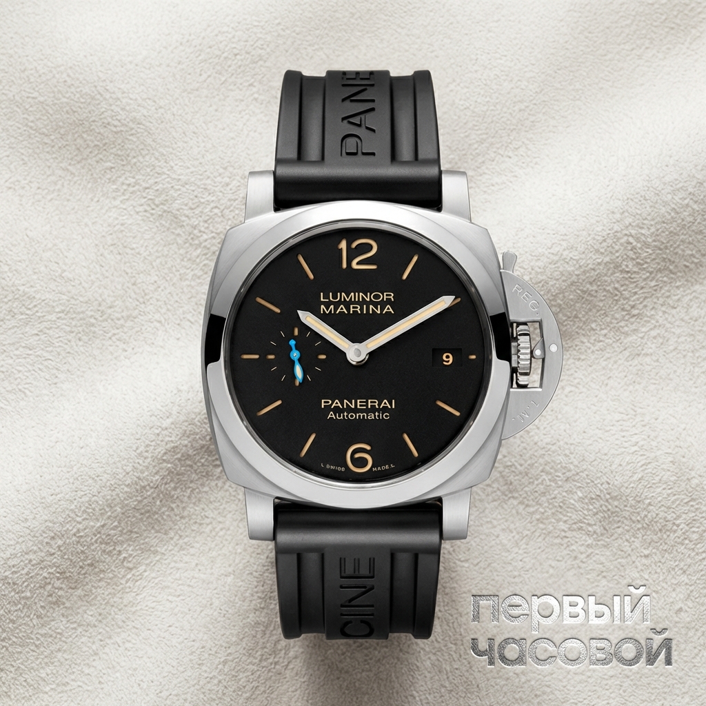 Поговорим о PAM 01351 по фактам. Перед нами классический «сэндвич» в корпусе Luminor 1950, и сразу предупреждаю: 44 миллиметра у Panerai — это не просто цифра, это серьезная шайба, которая требует широкого запястья. Если рука меньше 17,5 см, ушки корпуса будут висеть в воздухе, и смотреться это будет нелепо. Каучуковый ремень здесь — единственное верное решение для повседневной носки, так как кожа при водозащите 300 метров и активной эксплуатации умирает за полгода, а каучук вечен.