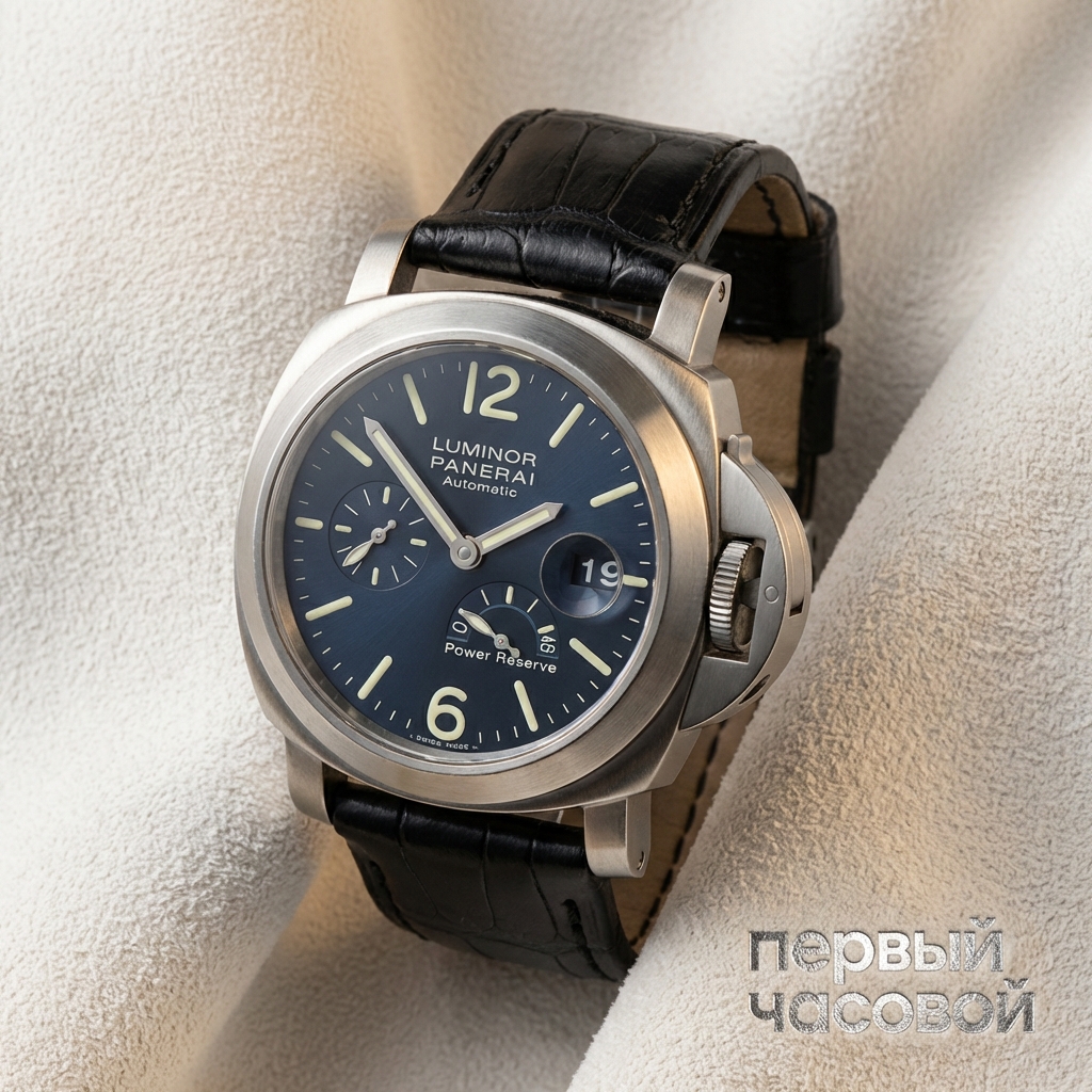 По технической части. PAM 093 интересен своим синим циферблатом. Это не каноничный черный сэндвич, поэтому модель на любителя, но цвет глубокий, «играющий», визуально выделяет часы из потока одинаковых Luminor Base. Индикатор запаса хода (Power Reserve) здесь — самое полезное усложнение. Вы всегда видите, заведен ли механизм, что критично для герметичности: лишний раз откручивать скобу и дергать заводную головку не придется. Внутри стоит надежный «трактор» на базе ETA/Valjoux. Это огромный плюс к стоимости владения: обслужить этот механизм сможет любой квалифицированный мастер, не требуя отправки на мануфактуру за безумный прайс.