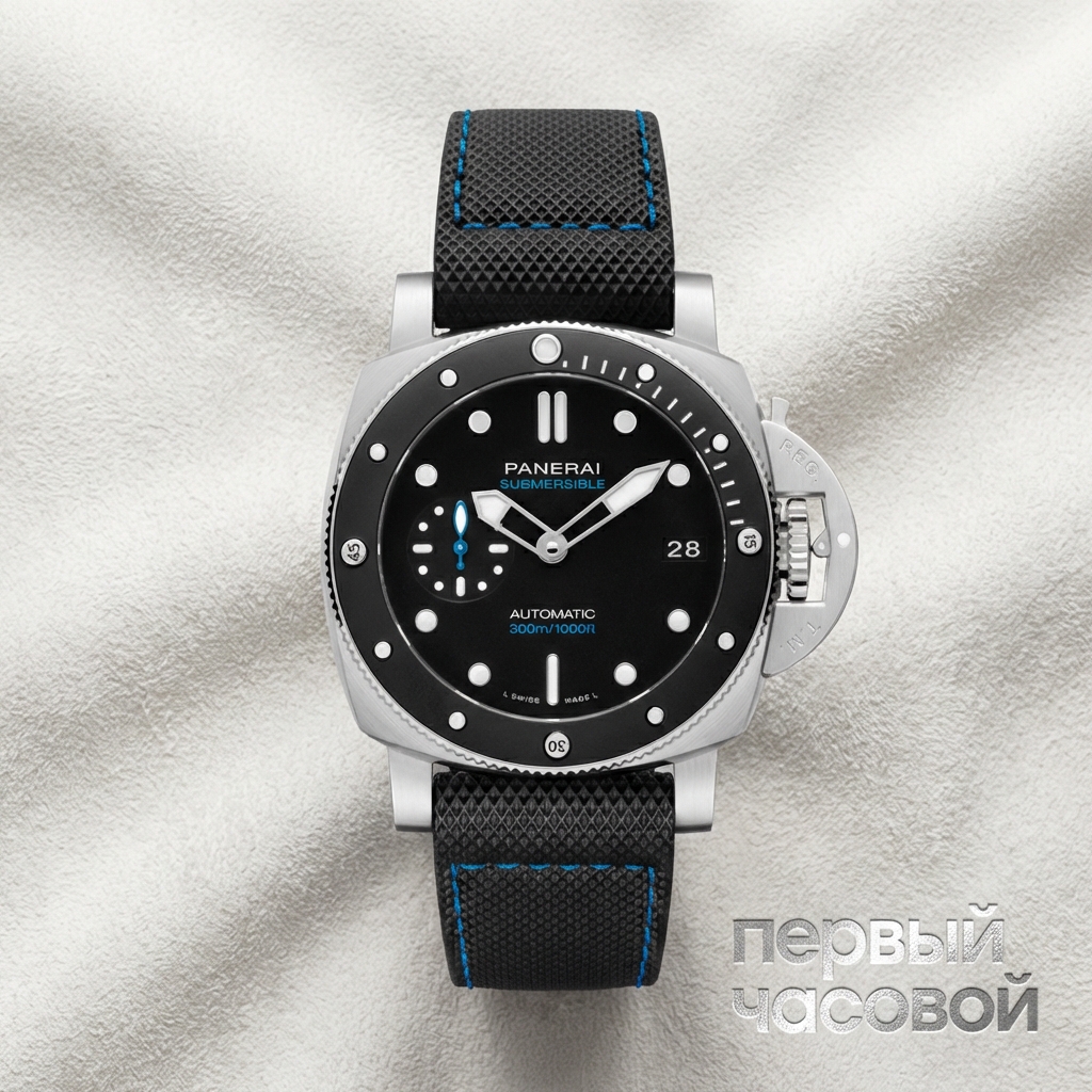 Panerai Submersible 42mm представляет собой современную интерпретацию профессиональных дайверских инструментов, адаптируя монументальную архитектуру корпуса Luminor 1950 под более универсальный диаметр. Корпус выполнен из коррозионностойкой стали AISI 316L с сатинированной отделкой, что подчеркивает утилитарное назначение модели и снижает заметность микроповреждений при эксплуатации. Характерная запатентованная скоба защиты заводной головки Safety Lock обеспечивает герметичность конструкции до глубины 300 метров.