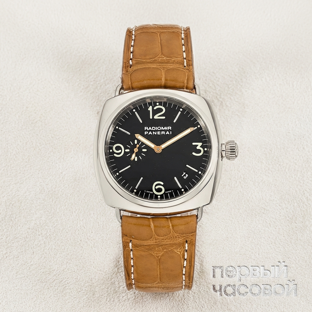Panerai Radiomir reference PAM00062 представляет собой редкий пример адаптации военной эстетики 1930-х годов к канонам высокого часового искусства в формате dress-watch. Корпус диаметром 40 мм, выполненный из 18-каратного белого золота, сохраняет классическую подушкообразную архитектуру, характерную для исторической линейки Radiomir, включая съемные проволочные ушки крепления ремешка. Полированный безель обрамляет лаконичную черную поверхность циферблата, где традиционные люминесцентные индексы дополнены апертурой даты в положении между 4 и 5 часами. Ключевой особенностью данного референса является его механическая начинка: калибр OP VII, построенный на базе легендарного ультратонкого механизма Zenith Elite 680. Использование этой базы позволило добиться существенного уменьшения толщины профиля по сравнению со стандартными моделями Panerai, обеспечив при этом запас хода до 55 часов. Завинчивающаяся заводная головка и задняя крышка гарантируют водонепроницаемость до 100 метров, сохраняя функциональность инструментальных часов в корпусе из драгоценного металла.