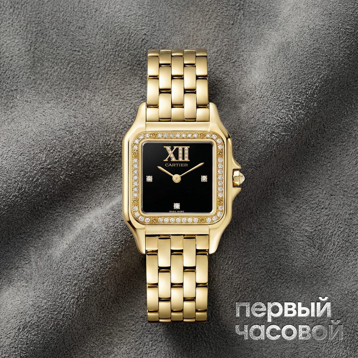 Корпус часов выполнен из желтого золота, чья теплая тональность контрастирует с глубоким черным цветом циферблата. Характерный квадратный силуэт с мягко закругленными углами инкрустирован бриллиантами классической огранки, причем особое внимание уделено точности расположения камней для создания непрерывной игры света. Текстура циферблата дополнена фирменным ромбовидным узором в виде сетки, на фоне которого выделяются вороненые стальные стрелки синего цвета — узнаваемый маркер ДНК Cartier. Инженерное решение браслета заслуживает отдельного упоминания: его звенья обладают исключительной гибкостью, повторяя движения запястья и обеспечивая эргономичную посадку, сопоставимую с пластикой живой пантеры.