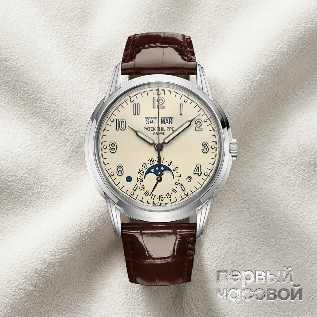 Функционал вечного календаря реализован через классические апертуры дня недели и месяца в позиции «12 часов» и аналоговый субдиск даты с индикатором фаз Луны в позиции «6 часов». Лакированный циферблат кремового оттенка оснащен накладными арабскими цифрами из черненого золота с люминесцентным покрытием, что обеспечивает утилитарную читаемость. Работу усложнений обеспечивает мануфактурный автоматический калибр 324 S Q, отмеченный клеймом Patek Philippe Seal, гарантирующим точность хода в пределах -3/+2 секунды в сутки.
