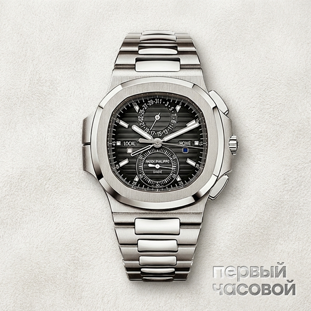 Patek Philippe Nautilus Travel Time Chronograph представляет собой сложную инженерную интерпретацию культового дизайна Джеральда Дженты, воплощенную в архитектуре из нержавеющей стали. Корпус диаметром 40.5 мм характеризуется сложной геометрией с чередованием сатинированных поверхностей и зеркально полированных фасок безеля, создающих игру света при малейшем движении запястья. Черный циферблат с горизонтальным рельефным узором обладает градиентным эффектом, темнеющим к периферии, и служит контрастным фоном для накладных часовых меток из белого золота с люминесцентным покрытием. Апертура даты расположена в положении «12 часов», а в нижней части циферблата находится 60-минутный счетчик хронографа.