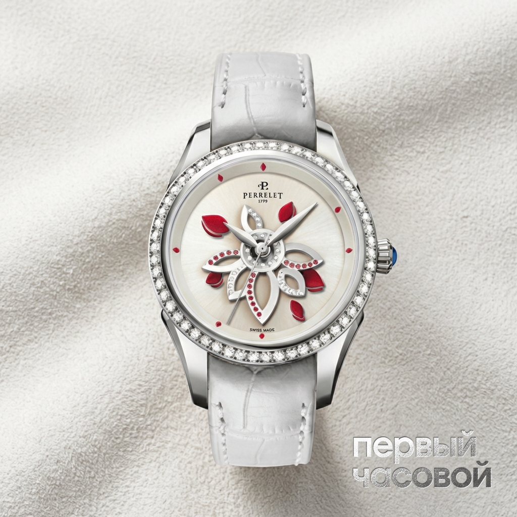 Perrelet A2037-1 представляет собой выразительный образец женской часовой механики, в котором техническая составляющая преобладает над декоративной. Корпус диаметром 38 мм обладает архитектурной сложностью, характерной для мануфактуры: боковые грани украшены фирменным вертикальным рифлением, создающим визуальный ритм и тактильную узнаваемость. Сапфировое стекло, устойчивое к механическим воздействиям, открывает вид на циферблат, являющийся сценическим пространством для демонстрации кинетических особенностей модели.
