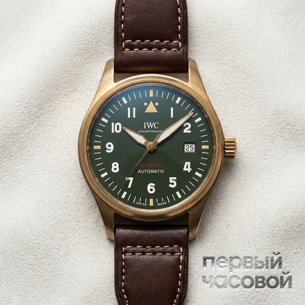 Бронза — материал капризный и специфический. Перед покупкой вы должны четко осознавать: эти часы будут темнеть, покрываться пятнами и пахнуть металлом, а в жаркую погоду могут оставить зеленый след на запястье. Это не брак, а физика, которую маркетологи продают как «индивидуальность». Если вы готовы к этому, то IWC IW326806 — одни из самых удачных бронзовых часов на рынке. Главная заслуга здесь в размере 39 мм. Наконец-то IWC сделали «пилота», который не свисает с запястья, как хоккейная шайба, и комфортно прячется под манжету.