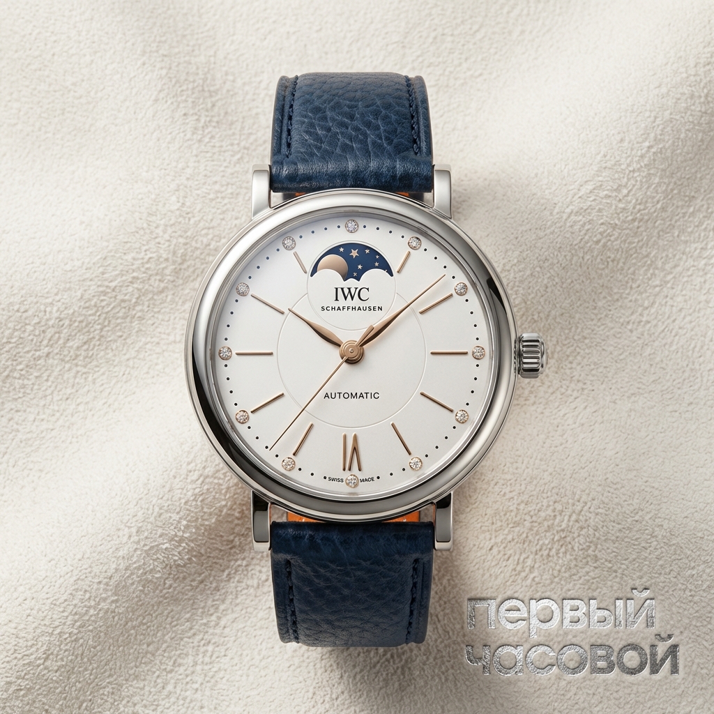 IWC Portofino Automatic Moon Phase 37 представляет собой эталонный образец рафинированной классики, выполненный в полированном корпусе из нержавеющей стали диаметром 37,1 мм. Архитектура модели восходит к эстетике карманных часов Lépine: минималистичный безель визуально увеличивает площадь посеребренного циферблата, обеспечивая идеальную считываемость накладных золоченых меток и стрелок формы feuille. Доминантой композиции выступает апертура индикатора фаз Луны в положении «12 часов», где золотой диск перемещается на фоне глубокого синего эмалевого небосвода.