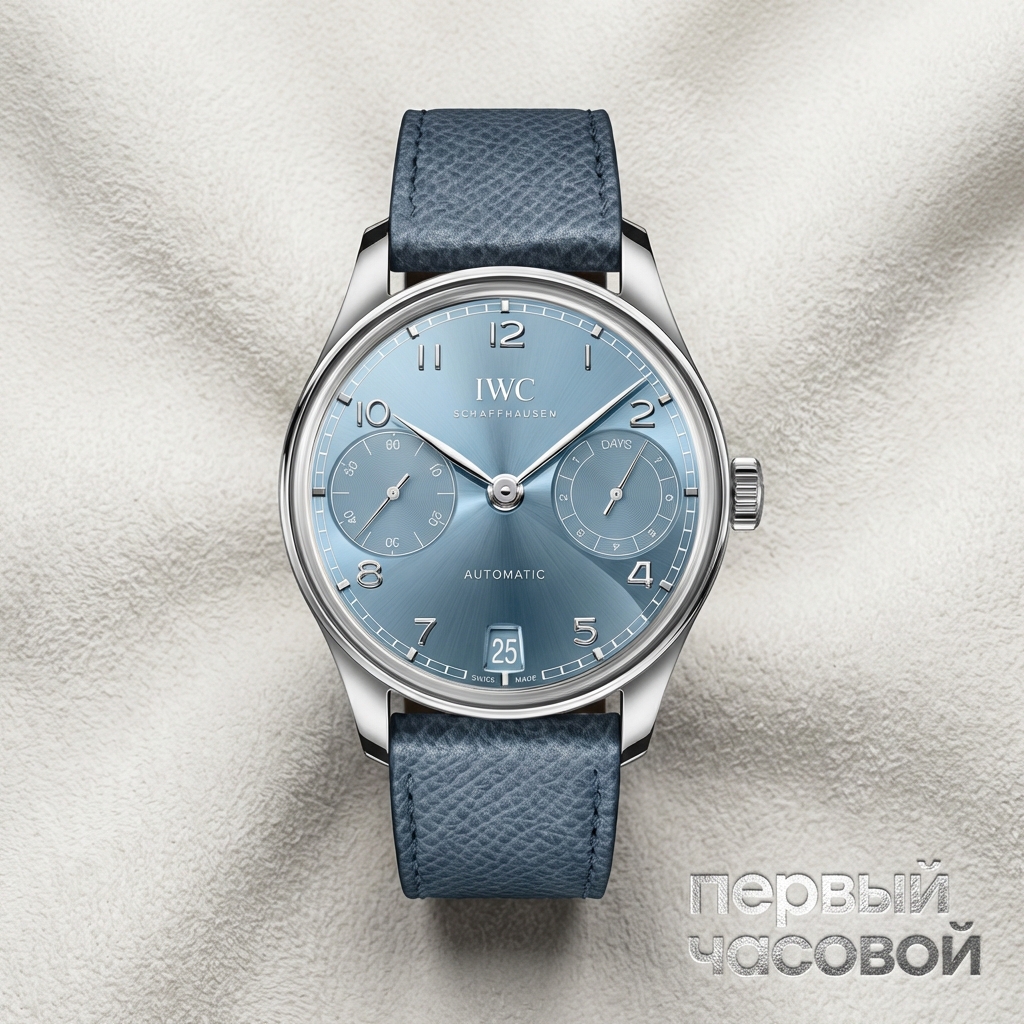 IWC Portugieser Automatic 42 представляет собой современную итерацию культовой модели, сохранившую архитектурные пропорции оригинала 1930-х годов. Корпус диаметром 42,4 мм выполнен из 18-каратного белого золота, чья холодная тональность подчеркивает глубину циферблата оттенка Horizon Blue. Визуальная доминанта смещена на симметричную компоновку субдисков: индикатор запаса хода расположен на отметке «3 часа», а малая секундная стрелка — на «9 часах». Характерная для линейки «железнодорожная» минутная шкала и накладные арабские цифры обеспечивают эталонную считываемость, свойственную морским хронометрам.