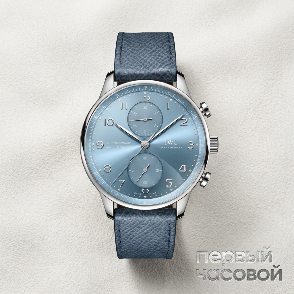 IWC Schaffhausen Portugieser Chronograph представляет собой квинтэссенцию мануфактурного минимализма, реализованную в корпусе из 18-каратного белого золота. Архитектура модели диаметром 41 мм характеризуется фирменным узким безелем, который визуально максимизирует апертуру циферблата редкого оттенка Horizon Blue. Накладные арабские цифры и родированные стрелки формы feuille обеспечивают эталонную читаемость, сохраняя верность историческим кодам морских навигационных приборов 1930-х годов.