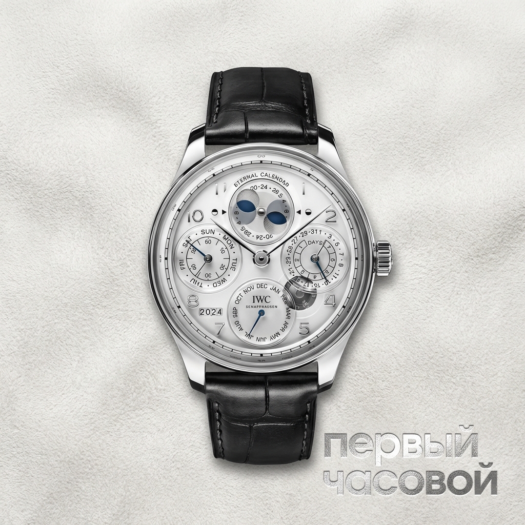 Сразу к фактам: это очень тяжелые и крупные часы. 44,4 мм в платине ощущаются на запястье как кастет, поэтому если у вас тонкая кисть, эргономика будет спорной. Это юбилейная модель к 150-летию IWC, референс IW505701, где совместили вечный календарь и турбийон. Визуально белый лаковый циферблат выглядит отлично, но главное здесь — механизм 51-й серии с 7-дневным запасом хода. Это критически важно для вечника: если часы встанут, настраивать их заново — то еще удовольствие, но здесь запас энергии огромный.