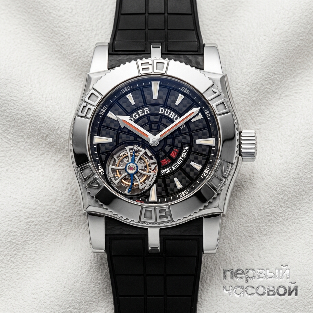 Roger Dubuis Easy Diver Tourbillon представляет собой парадоксальный синтез высокого часового усложнения и монументальной архитектуры спортивного инструмента. Корпус диаметром 48 мм, выполненный из нержавеющей стали, демонстрирует фирменную геометрию мануфактуры с характерными тройными ушками крепления ремня и агрессивно рифленым безелем, предназначенным для удобного захвата.