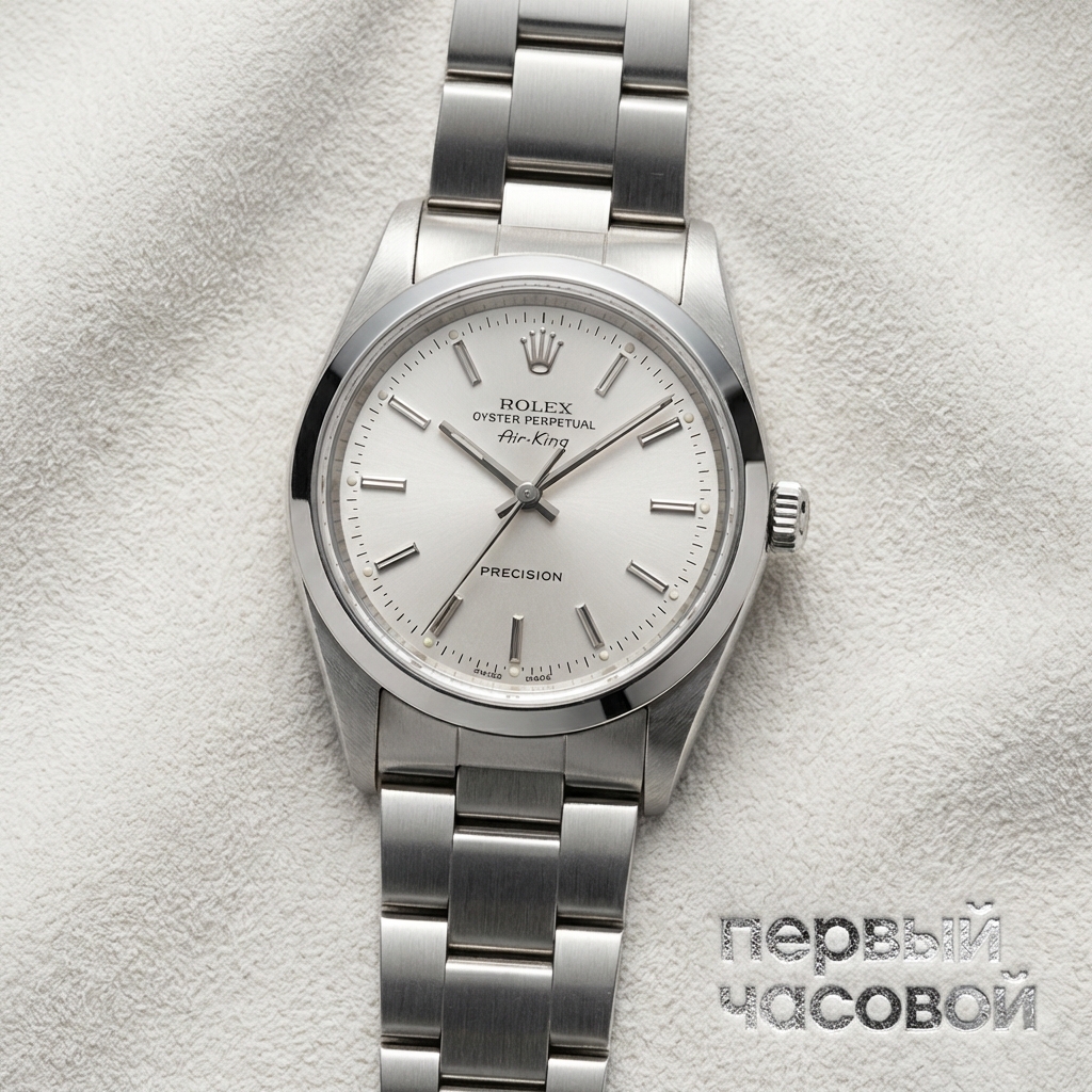 Rolex Air-King, референс 14000M, представляет собой значимый этап технической эволюции в рамках одной из старейших коллекций мануфактуры. Архитектура корпуса Oyster диаметром 34 мм выполнена из стали, демонстрируя характерное чередование сатинированных поверхностей ушек и полированных боковых граней, что создает строгий визуальный баланс. Гладкий стальной безель подчеркивает геометрическую целостность конструкции, визуально объединяя плоское сапфировое стекло с корпусом в единый монолит. Отсутствие апертуры даты на циферблате сохраняет идеальную симметрию часовых меток и чистоту композиции, характерную для инструмент-часов середины XX века.