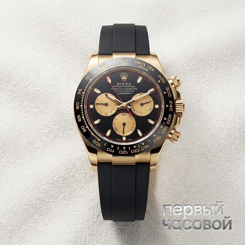 Daytona 116518LN в желтом золоте на каучуке — это, пожалуй, самая утилитарная версия золотого хронографа, которую можно придумать. Ойстерфлекс решает главную проблему золотых браслетов: он не царапается об стол, не растягивается со временем и делает часы легче, смещая центр тяжести на запястье для идеальной посадки. Керамический безель здесь не для красоты, а как защита — именно эта деталь чаще всего принимает на себя удары, и на керамике следов не остается, в отличие от мягкого золота ранних референсов.
