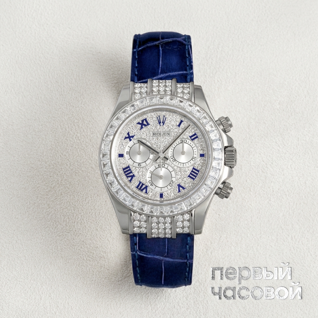 Золотая Daytona на коже — это история не про автоспорт, а про тяжелый люкс и вечерние выходы. Несмотря на гендерную маркировку "женские", 40 мм в белом золоте — это массивный аксессуар, который на тонком запястье работает как акцентная манжета. Надо понимать физику материала: белое золото мягче стали, поэтому микроцарапины на полированных гранях появятся моментально, а глубокая полировка может нарушить геометрию корпуса. Кожаный ремень делает часы исключительно сухопутными: хотя заявлена водонепроницаемость 100 метров и стоят винтовые пушеры, мочить ремешок — значит выбросить его через сезон. Механизм 4130 обсуждать бессмысленно — это "трактор", самый надежный хронограф в индустрии, который переживет владельца. Главный нюанс здесь — отсутствие коробки и документов. Для модели с камнями это серьезный удар по ликвидности и инвестиционному потенциалу, поэтому покупка оправдана только при адекватном дисконте.
