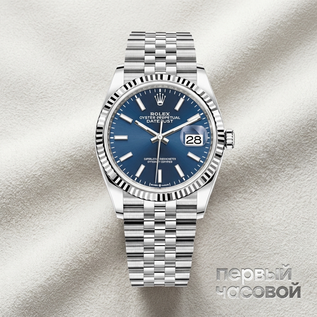 Rolex Datejust 36 представляет собой эталон классической архитектуры наручных часов, сохраняющий актуальность кодов, заложенных при появлении коллекции в 1945 году. Корпус диаметром 36 мм выполнен в биметаллической концепции White Rolesor: средняя часть корпуса изготовлена из коррозионностойкой стали Oystersteel, а рифленый безель — из 18-каратного белого золота. Геометрия безеля с его характерными гранями обеспечивает интенсивную игру света, создавая визуальный контраст с сатинированными и полированными поверхностями браслета и ушек. Сапфировое стекло с линзой Cyclops над апертурой даты гарантирует читаемость показаний и защищает циферблат от внешних воздействий.